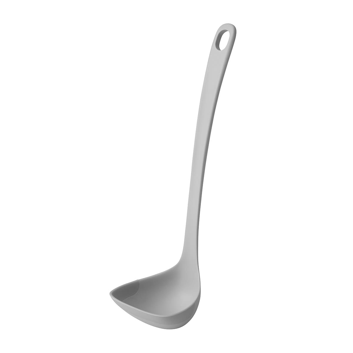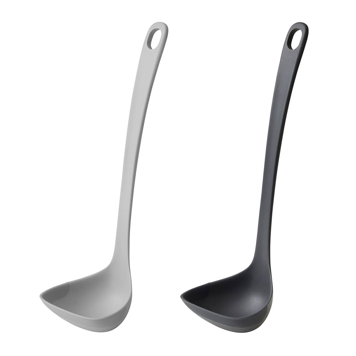 Mサイズは、大皿料理や家族分の味噌汁、盛り付けなどにピッタリなサイズ。 お玉の先端をハマグリ形状にすることで、鍋のフチや底、カーブにフィットして、残さずきれいにすくい取れます。また、角を使って細く安定して注げます。まさに「すくいやすさ」に特化したお玉です。もう、鍋底に残る具材にイライラしません。 鍋底にフィットする「特殊な先端形状」 お玉の先端が直線的なカーブになっていて、鍋のカーブや底に沿うように設計されています。スープやシチュー、カレーなどが鍋底に少し残った状態でも、スムーズにきれいに最後まで残さずすくい取ることができます。 使い勝手の良い「Mサイズ」 大皿料理や家族分の味噌汁、スープなどの調理・盛り付けに使いやすい容量です。大きすぎず小さすぎない絶妙なサイズ感です。 細口のボトルやマグカップにも注ぎやすく使いやすいです。 安定感のあるグリップ 柄の部分は丸くて持ちやすく握りやすいので、力を入れすぎず安定してすくえます。 柄を立てて使えるのでお玉の重さを感じにくく、手や手首の負担が少なく楽に使えます。 耐熱性・耐久性のある素材 フッ素加工の鍋やフライパンを傷つけにくい素材なので気兼ねなく使えます。耐熱温度230℃なので、食器洗い乾燥機(食洗機)に対応していてお手入れも簡単です。 カラーのこだわり ナイロン製のキッチンツールの定番色はブラックですが、明るい色調のキッチン空間には馴染みにくいですよね。一方、清潔感のあるホワイトは着色汚れが目立ってしまいます。 そこで、キッチンに馴染みやすいダークグレーと、明るい色も楽しみつつ、着色汚れが目立ちにくいグレーの2色展開です。 コンパクトで小回りの利くSサイズと、毎日使いにちょうどいいMサイズの2サイズ展開です。 >>Sサイズはこちら