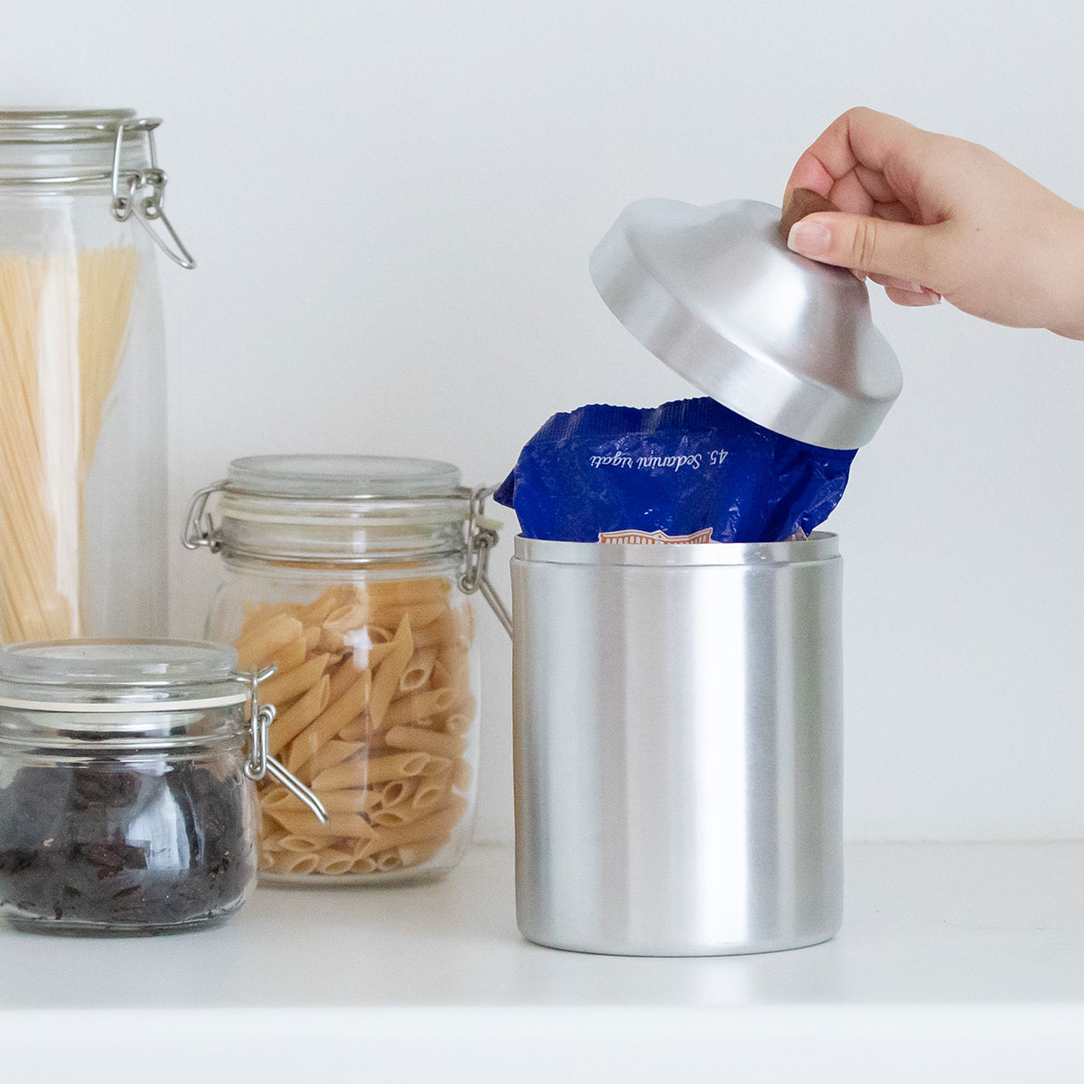 置いてあるだけで空間を彩るデザインのキャニスターです。 冷たくなりがちなアルミと、自然のぬくもりを持つ木のつまみが絶妙なコントラストを生み出します。その佇まいは、まるで長い時を経てきたような特別な存在感があり、インテリアとしても楽しめます。 アンティークのような魅力を持ちながら、現代的なインテリアにも馴染む新鮮なデザインです。何を収納するか、使う人の想像力を掻き立てる、自由度の高い保存容器です。 アルミのボディと天然木のアカシアのつまみの組み合わせが、懐かしいのに新しい雰囲気をかもし出します。キッチンやリビングの見せる収納として最適です。 日常使いに便利なMサイズ(容量1,300ml) Mサイズは、コーヒー豆やシリアル、パスタなどの乾物などの食材や、細々した日用品の収納に最適です。出し入れしやすいサイズ感で、日常の様々なシーンで活躍します。 重ねて収納できる S、M、Lの3サイズ展開(別売)です。 使わないときはマトリョーシカのように重ねて収納できます。スペースを取らず、美しく整理整頓が可能で、コンパクトにまとめられる設計です。 >>その他のサイズはこちら 経年変化を楽しむ アルミニウムと天然木は、使い込むほどに素材の風合いが変化していきます。 日々の暮らしとともに生活に馴染んでいき、長く使い込むほどに愛着が湧く、そんなアイテムです。 アルミニウム(アルミ)は、軽くて丈夫で熱や電気を伝えやすいです。 製品の加工がしやすく、使い終わった後のリサイクルも容易で、優れた特徴を多く持つ金属です。 その丈夫な素材から自動車やパソコンなどの部品、航空機の機体などにも使われています。