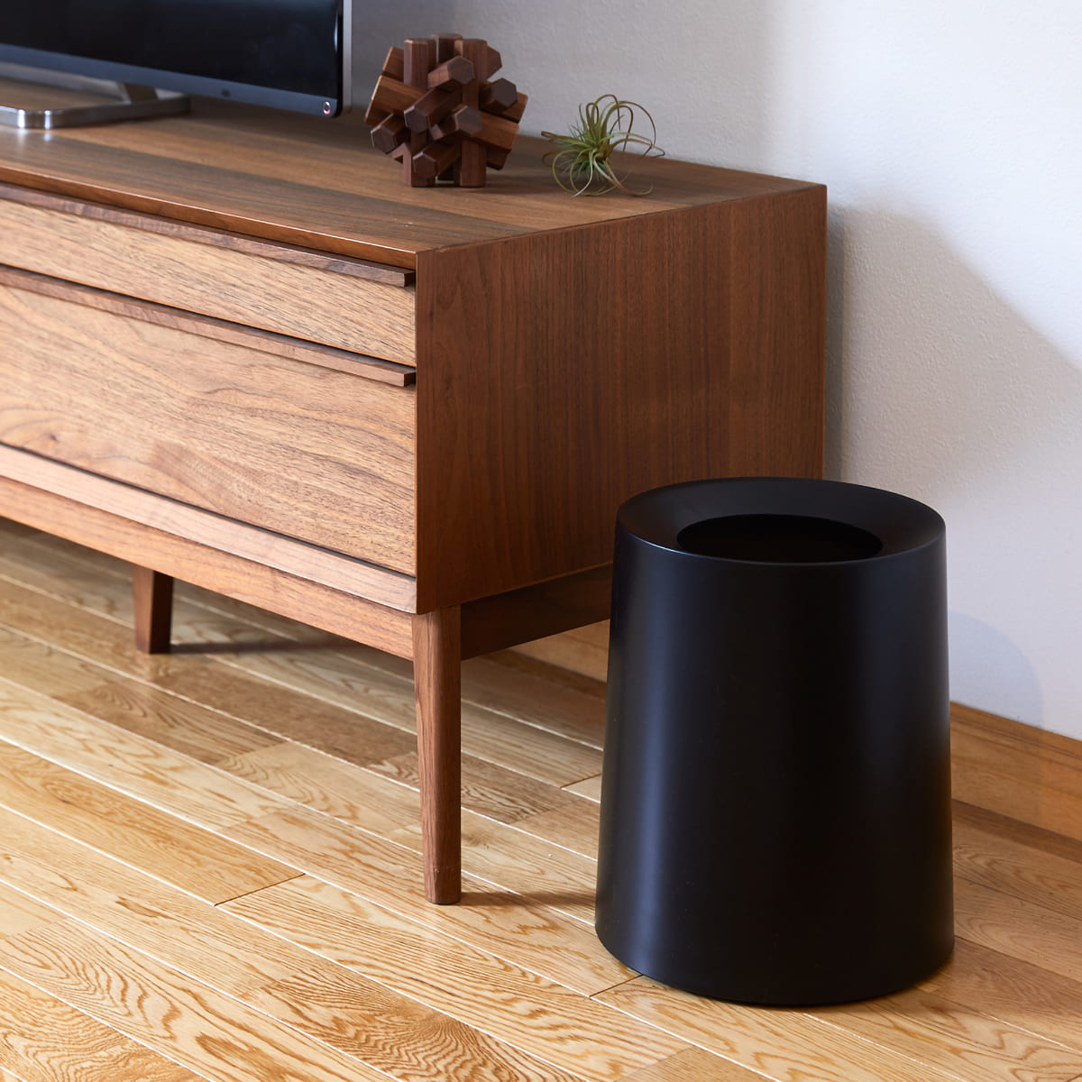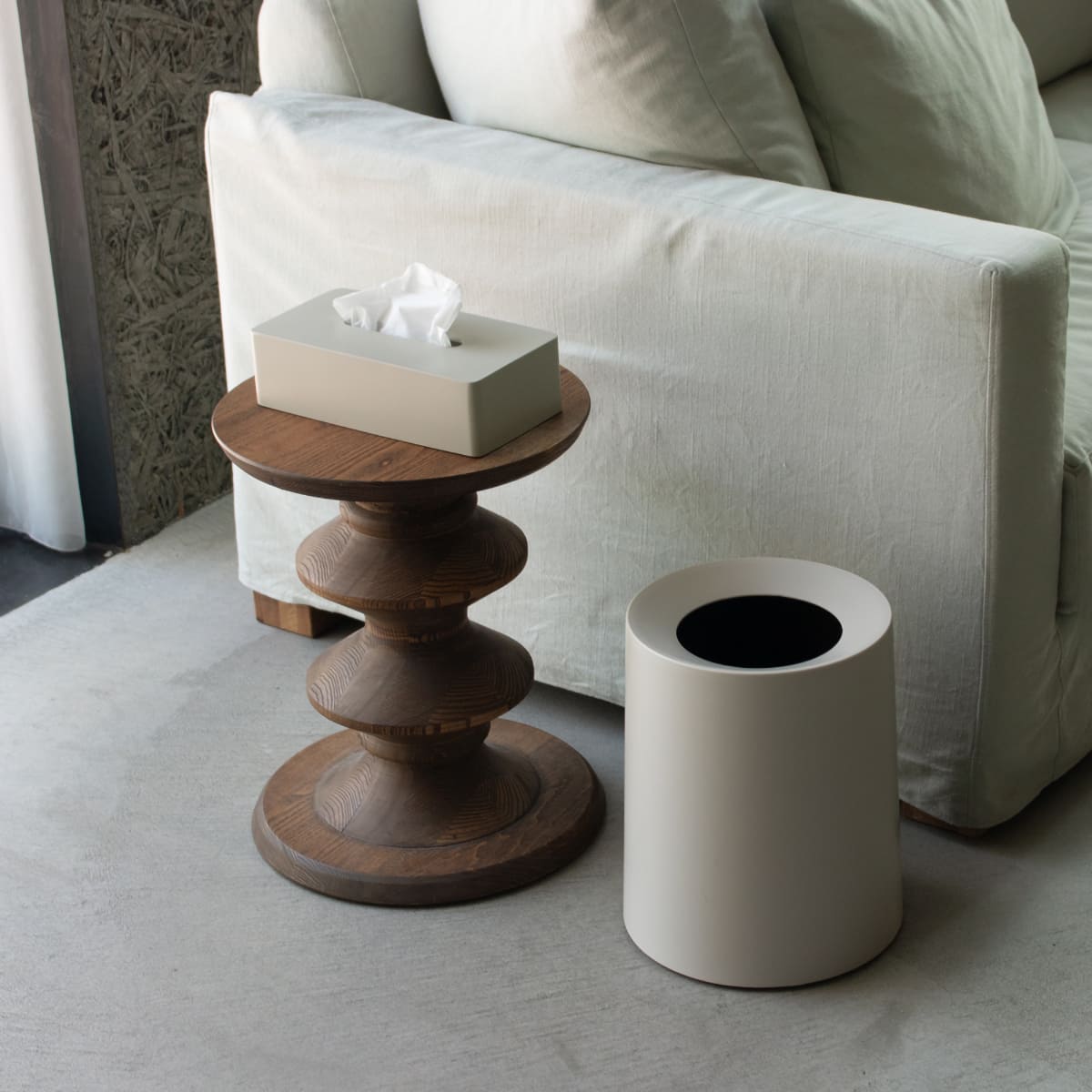ゴミ袋が見えない二重構造です。 使い方はとっても簡単で、ポリ袋を本体にとりつけてその上からカバーを被せるだけ。外からゴミ袋が見えなくなるので、部屋全体がすっきりと見えて、スタイリッシュに生活感のあるゴミ袋をすっきりと隠すことができます。 口に傾斜が付いているので、ゴミを捨てやすいデザインになっていて、ゴミ袋が見えにくくなっています。 中のゴミ箱には持ち手になる穴があるので、持ちやすく捨てやすいです。 忙しい毎日でも、お掃除やゴミ捨てが簡単にできる家事ラクアイテムです。 表面はマットな仕上がりで落ち着いた雰囲気です。 このマットな質感と円柱形のおしゃれなシルエットが、リビング、ダイニングはもちろん、寝室やサニタリーなど、いろんなインテリアに合わせやすく、見せて置きたいゴミ箱です。 容量は約11.4Lで、ideacoのゴミ箱の中でも特に人気のあるサイズです。 リビングや寝室で使うのにちょうど良い大きさで、頻繁にゴミを捨てる必要がなく、かといって大きすぎることもありません。 ポリプロピレン製なので、汚れても丸洗いができる点も衛生的に使えます。 TUBELOR HOMMEは、ただゴミを捨てるための道具ではなく、インテリアの一部として機能するようデザインされています。