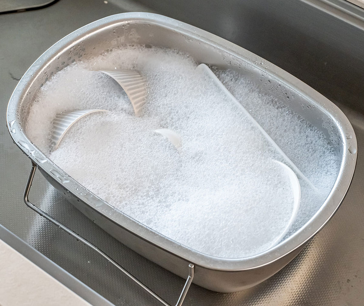 使った後は立てて置けます 側面には桶を立てて置くことができるスタンドが付いているので、安定して立てられるます、水切りがしやすいです。 底足付きなのでシンク内の水の流れを妨ぎません。ステンレス製だからお手入れも簡単です。 深さがたっぷりあります 容量は7.6Lあるので、野菜を洗ったり、お皿のつけ置きや水筒、ふきんの漂白などができます。 ※高濃度や⾧時間のご使用はお控えください。 食材が溢れ出にくいです 側面の穴から余分な水が流れるので、流水で野菜を洗うときに食材が溢れ出にくいです。水道水を流したまま野菜を冷やしたいときにも便利です。 水切りかごと重ねて使えます 「水切りかご」がぴったり重なり、洗い桶を水受けトレイの代わりとして使用できます。 重ねることで、野菜洗いやつけ置き洗いにも便利に使えます。 >>【家事問屋】水切りかごはこちら ※ご購入の前に知っていただきたいこと 細かなキズや凹凸、曲げ跡、溶接跡について 製造時に機械や金型と触れたり研磨したりすることで発生する細かなキズや凹凸、ステンレスを曲げる際についた筋、溶接による凹凸などがみられる場合がございます。製造工程上のものですので、ご了承ください。また時折、確実に溶接するため、黒くヤケ跡が残ることがございますが、品質に問題はなく、サビではございません。 つけ置きについて 重曹とクエン酸(弱酸性と弱アルカリ性のもの)のつけ置きにはご使用いただけます。ただ、高濃度や⾧時間のご使用はステンレスの変色などの原因となりますので、1~2時間程度のつけ置きに留めてください。また塩素系洗剤はご使用いただけません。