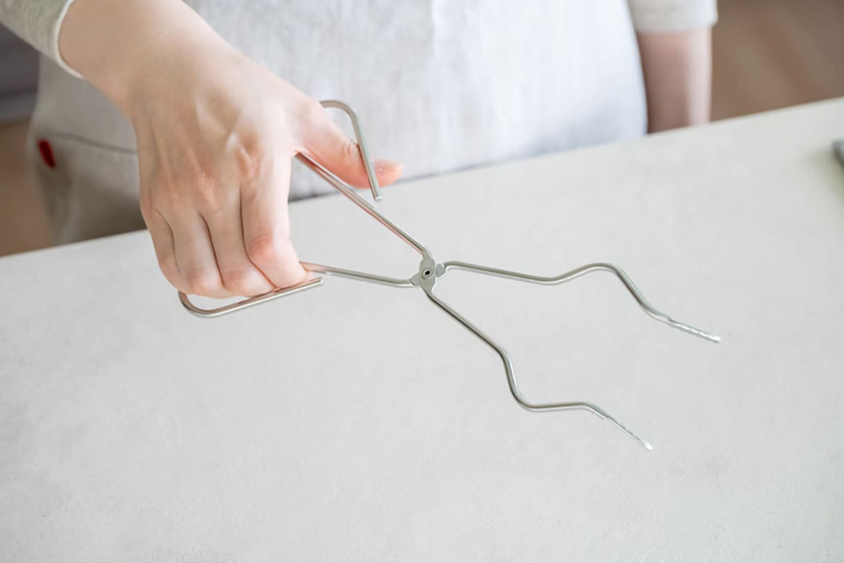 ジャムを作った時や塩麹を作るときなど、保存瓶を煮沸するときに、熱々のお湯の中の瓶がうまくつかめなくて、やけどをしたり、瓶をお湯の中に落として水浸しになったことはありませんか? そんなお悩みにぴったりの煮沸トングです。 瓶の煮沸以外にも、ふきんの煮沸、オーブン料理時の蓋の開閉などいろいろなシーンで使っていただけます。 先端に溝が付いています 挟むときに滑りにくいよう、先端にギザギザとした溝が付いています。瓶のフタやふきんなどをしっかり掴むことができます。 瓶の取り出しに便利な形です ワイヤーが「くの字」に曲がっているので、口径6~7cmの瓶であれば横から掴むこともできます。瓶の中入った水を切りたいときに、落とす心配が少なくなります。 瓶をひっくり返す動作も楽にできます 瓶の口付近の溝を挟めば、瓶を逆さにひっくり返すことも楽々。熱い瓶に直接触れずに済むので安心です。 ※ご購入の前に知っていただきたいこと トングの開きが硬い場合 トングを開く際に、硬い場合がございますが、開閉しているうちに柔らかくなります。