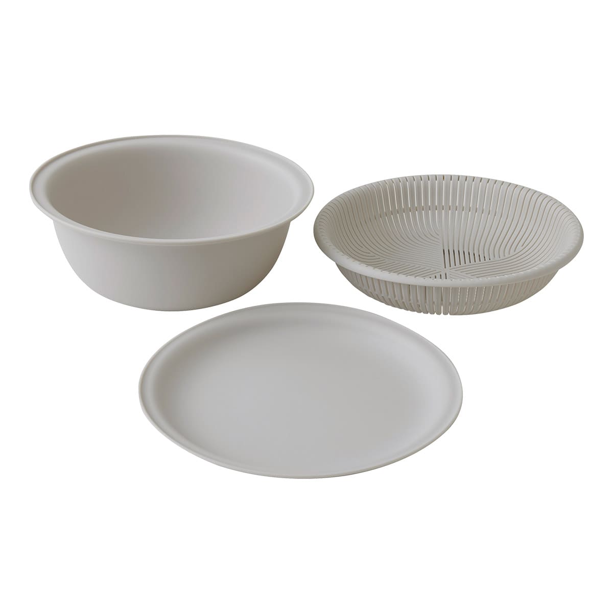 多用途に使える「3in1セット」 浅めのザルは、湯切りや水切り、ゆでた麺類・野菜・豆腐・油揚げの油抜きなど、効率よく水切りできます。