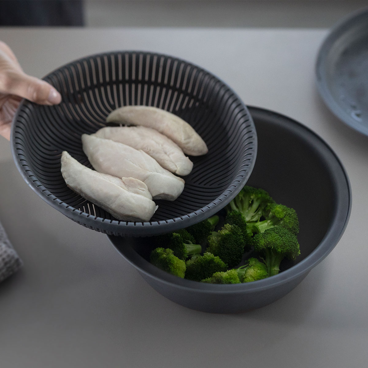 ザルとボウルを別々に使うことも、重ねて使うこともできるため、調理内容に合わせて自在に組み合わせて使用できます。