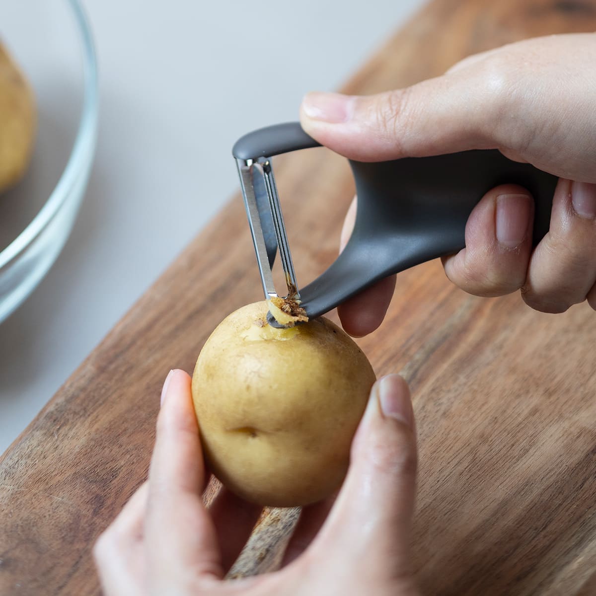 手になじんで動かしやすく、芽取りもスムーズにできるピーラーです。剥いた皮が張り付くことなく、下に向かってするんと落ちます。 手にフィットして、細かい作業もスムーズに 剥いた皮が下にするんと落ちて、調理台やシンクが散らかりません。 握るだけで自然とフィットする形状 握ると裏側のくぼみに自然と指がかかり、柄全体が手のひらにフィットします。 刃と手元が近いので小回りや効きやすいです。刃の両端に指を添えて持つと使いやすいです。 持ち替え不要の「内側芽取り」 「芽取り」が内側に付いているので、持ち替える必要がなくスムーズに作業できます。 小さな手にもなじむコンパクトサイズ 手になじむことを考えて設計された、コンパクトでやさしいカーブのかかったかたちです。手の小さな女性でも、手のひらに収まって軽い力で剝きやすくなっています。 ステンレス刃で、どんな食材も気持ちよく剥ける 小さなじゃがいもからリンゴのようなカーブのある果物まで対応。 ステンレス鋼の刃がスルスルと心地よい切れ味で皮を剥いてくれます。